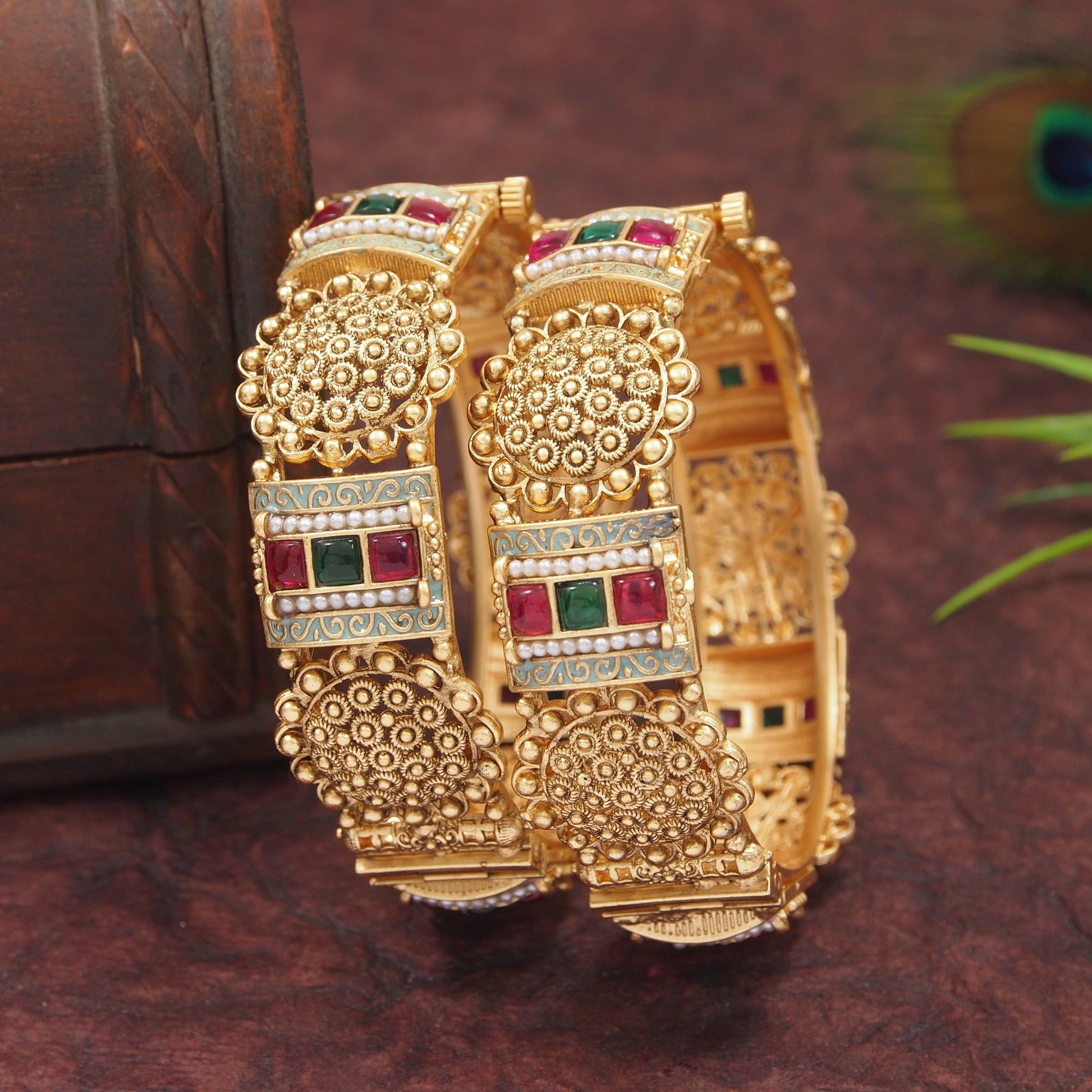Antique Gold Plated Bangles with Red & Green Stone and Pearl Detailing