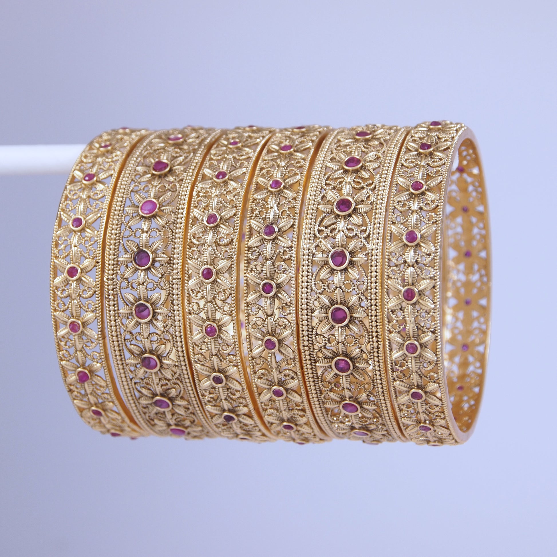 Orna presents a gracefully crafted jewellery piece with these Rajwadi Gold Matte Finish studded designer bangles. Designed with intricate floral and lattice detailing, each bangle is highlighted with ruby-tone stone accents that add depth and a rich ethnic appeal. Available in multiple sizes, you can choose the perfect size as per your wrist measurement.