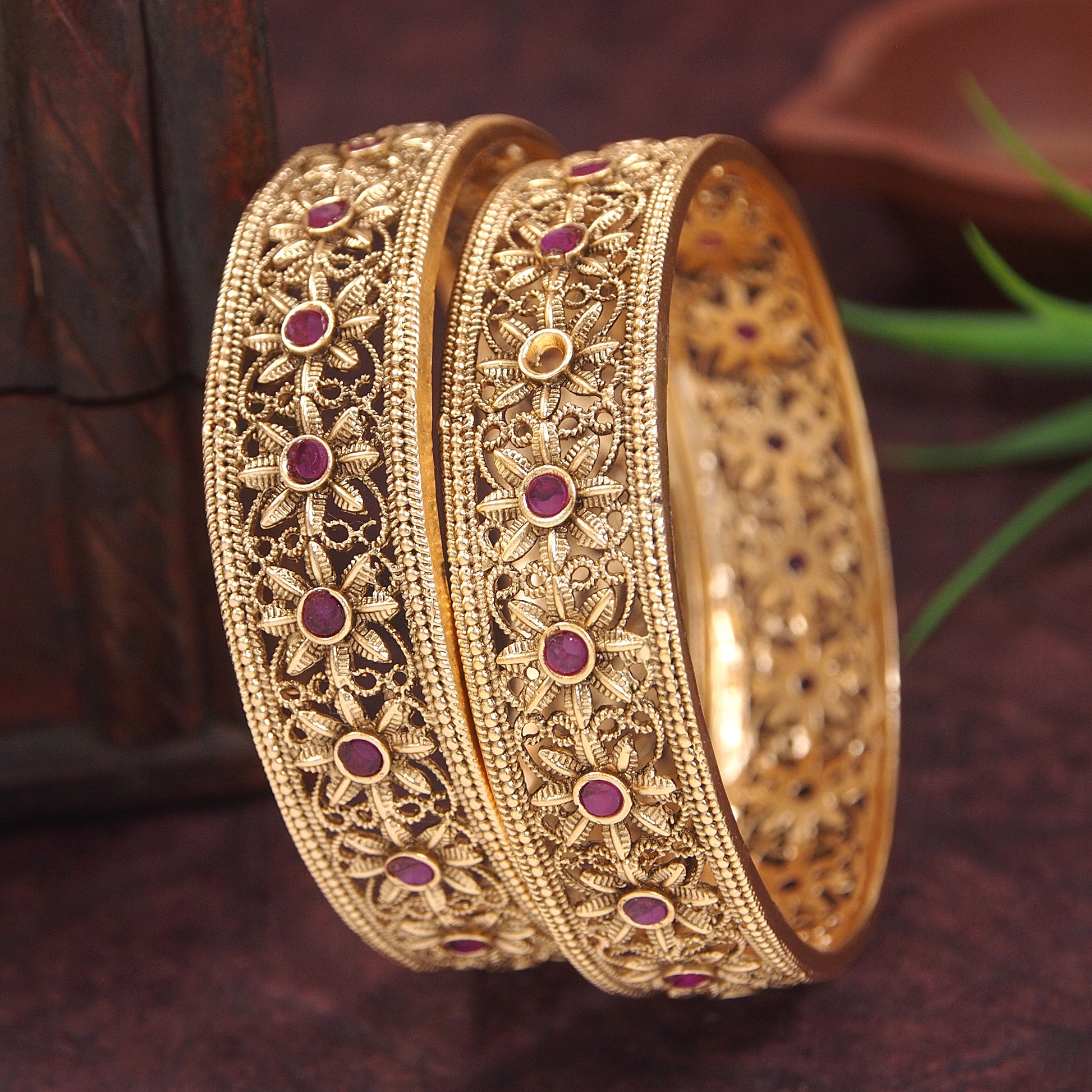 Orna presents a gracefully crafted jewellery piece with these Rajwadi Gold Matte Finish studded designer bangles. Designed with intricate floral and lattice detailing, each bangle is highlighted with ruby-tone stone accents that add depth and a rich ethnic appeal. Available in multiple sizes, you can choose the perfect size as per your wrist measurement.