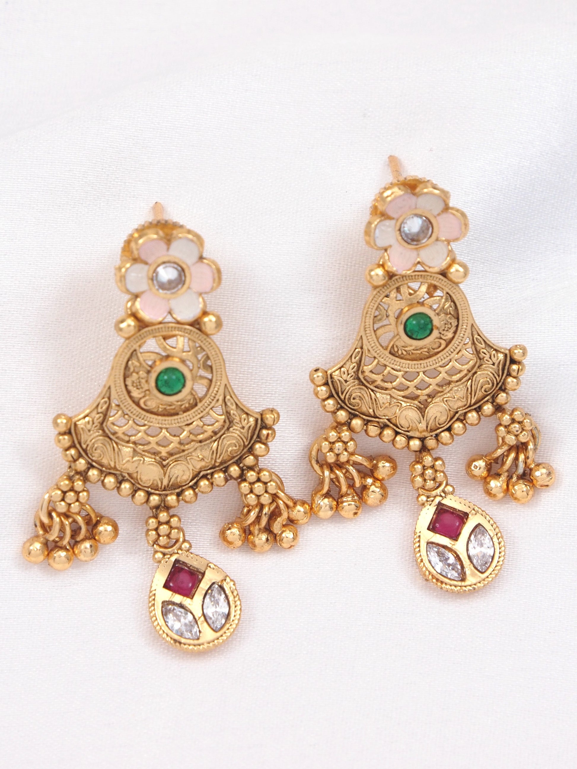 Orna brings this gold plated long Rani Haar necklace set featuring temple-inspired carvings, antique detailing, and elegant red, green, and white stone embellishments. The multi-layered chain with matching earrings gives a classic traditional look. Perfect for weddings, festive occasions, bridal wear, and traditional celebrations.