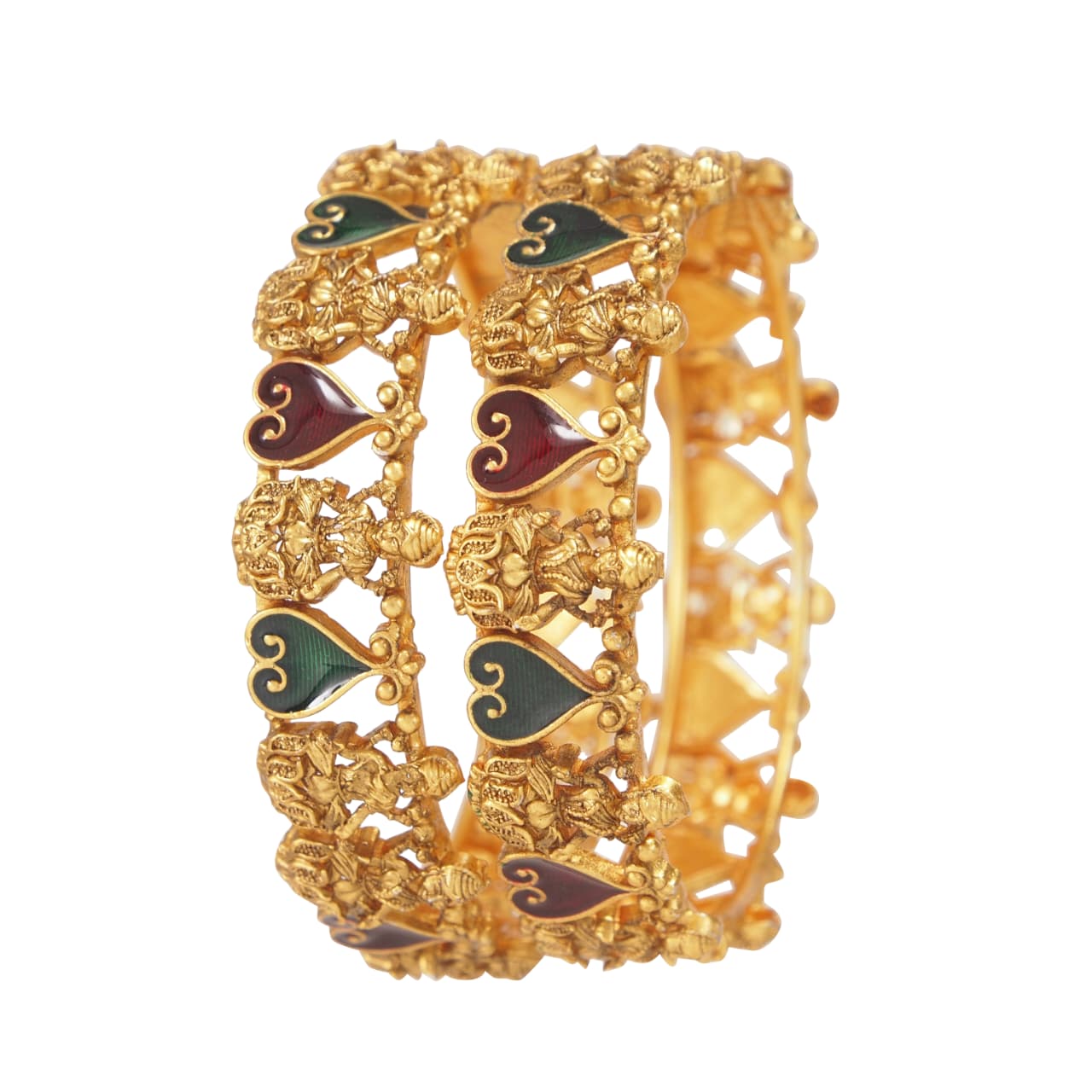 South Indian Lakshmi Temple Style Matte Gold Bangles with Red & Green Meenakari