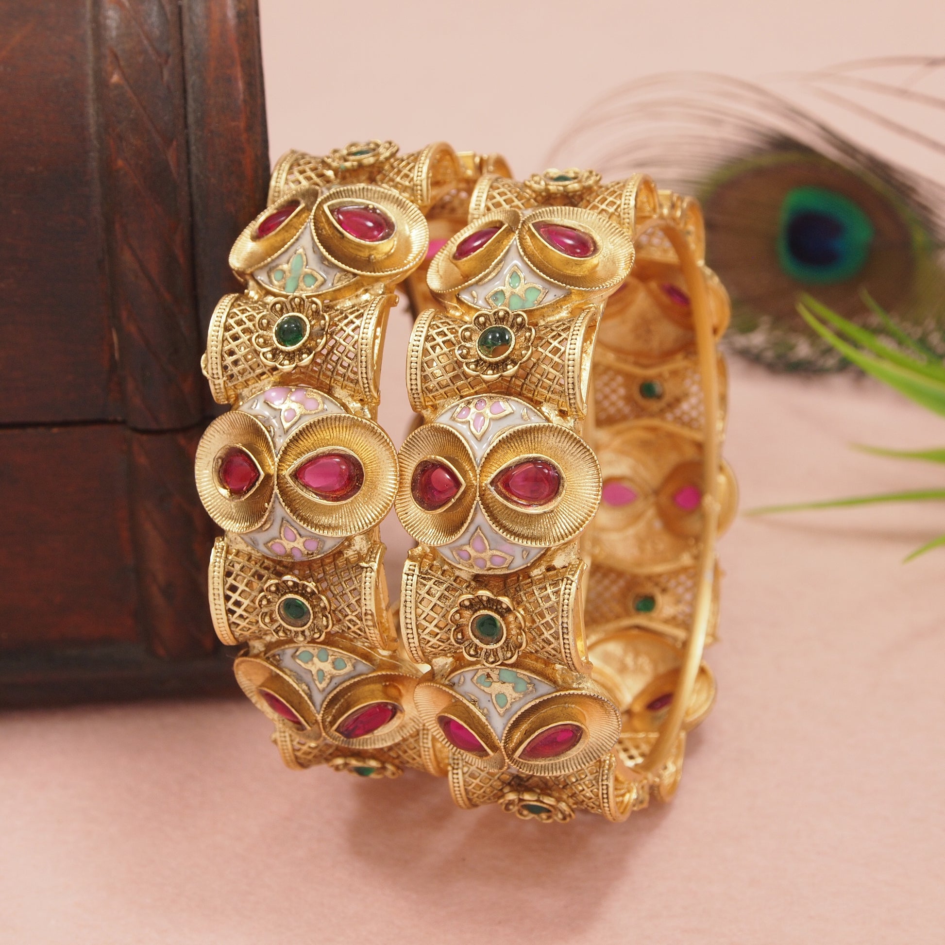 Traditional Gold Plated Antique Bangles with Ruby & Green Stone & Meenakari Work