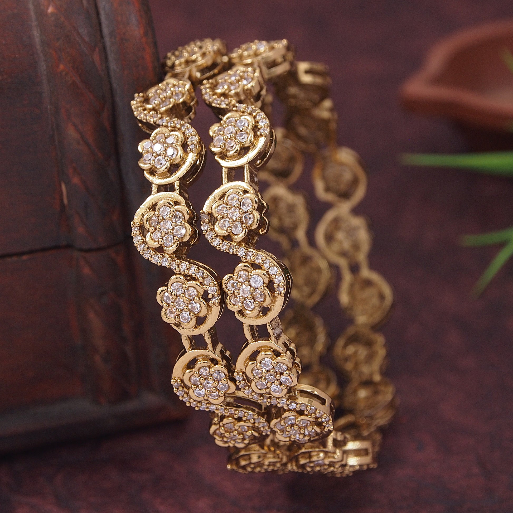 Orna Exquisite Floral Brass Gold-Plated Bangles with Cubic Zirconia